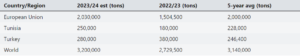 Meanwhile, exports in Turkey are expected to fall from their record-high levels of 2022/23 to 160,000 tons in 2023/24. Still, Turkish exports are expected to remain well above the five-year average due to the upward trend in production compared to stable consumption.